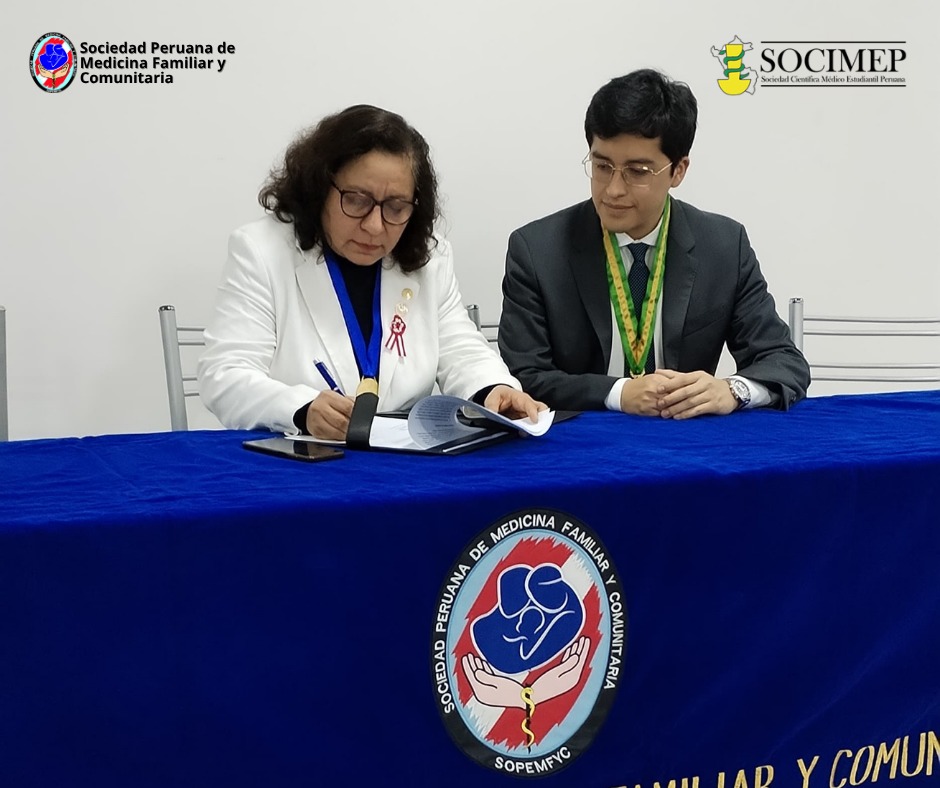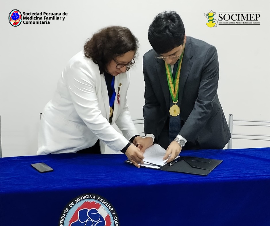 El acuerdo fue suscrito en la ciudad de Lima por la presidenta de SOPEMFYC, Dra. Rosemary Moscoso Chirinos, y el Est. Med. Sebastián Antonio Lavado Arestegui, Consejero Regional Centro de SOCIMEP, como representante de su presidenta, Janith Paola De la Cruz Galán.