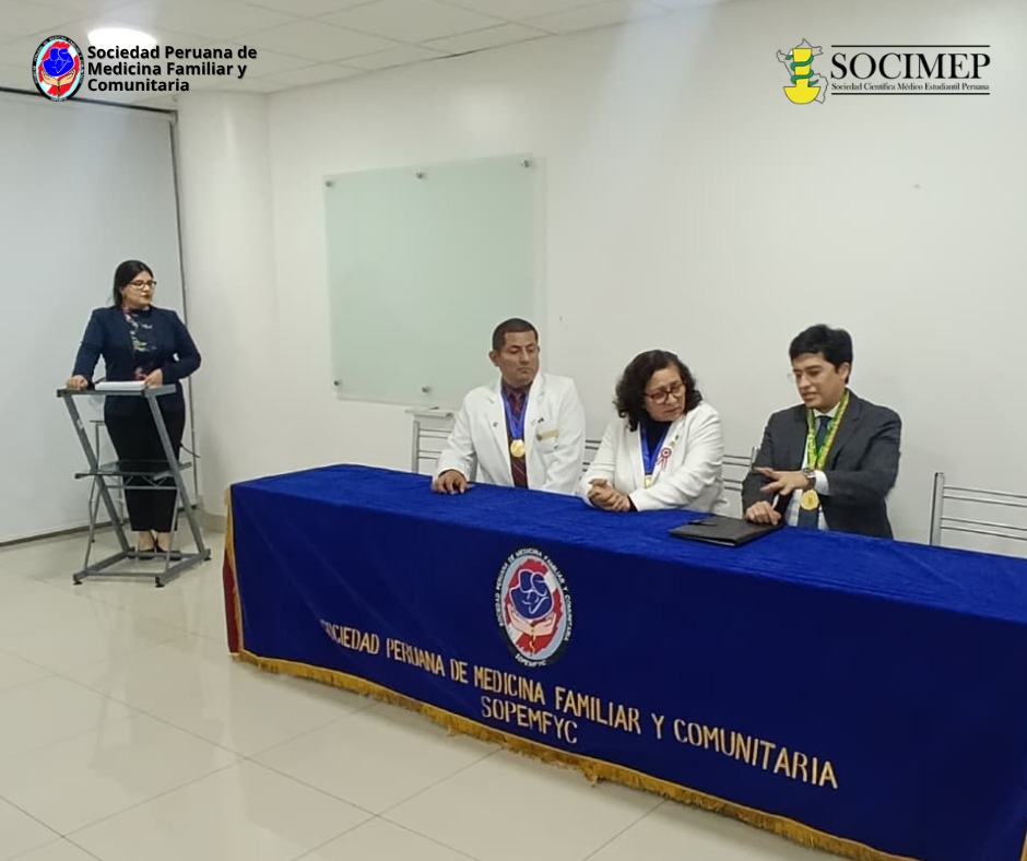 El pasado 30 de julio de 2025, la Sociedad Peruana de Medicina Familiar y Comunitaria (SOPEMFYC) y la Sociedad Científica Médico Estudiantil Peruana (SOCIMEP) firmaron una alianza estratégica orientada a promover la formación, la investigación y el trabajo conjunto entre médicos especialistas y estudiantes de medicina.